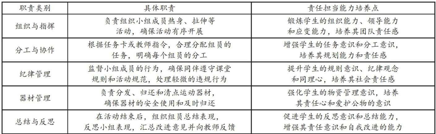 [摘要]小学体育课“小组长”制度的实施能有效激发学生责任担当意识,促进学生在多重角色转换中获得成长。“小组长”制度主张明确地划分职责,驱动学生责任意识的觉醒,逐步形成尊重规则和自我管理的意识。围绕体育课堂“小组长”制度展开研究,分析体育课堂“小组长”制度对学生责任担当能力培养的作用,并阐述了“小组长”制度实施的策略。