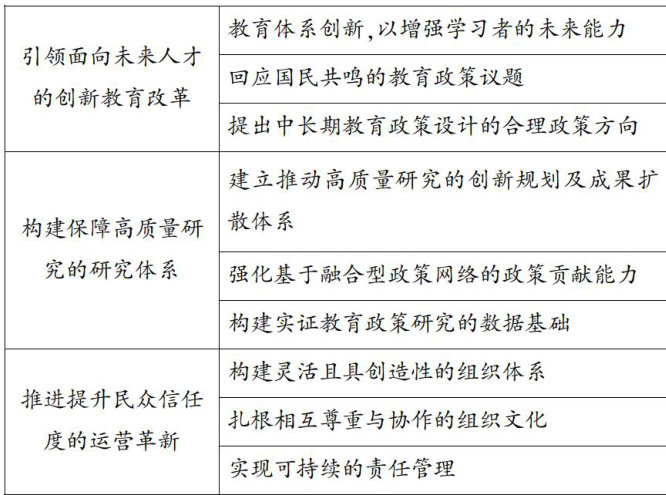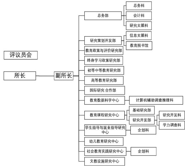 摘要:教育智库是教育强国建设的重要依靠力量。借鉴世界一流教育智库的建设经验,有助于推动我国教育智库高质量发展,进而更好地支撑服务教育强国建设。自1949年成立以来,日本国立教育政策研究所聚焦教育政策与实践开展研究,在参与政策研制、教育科学研究等方面发挥了重要作用。在组织模式上,日本国立教育政策研究所设有一个评议员会、一个总务部、六个研究部和六个研究中心,各部门设置精细、边界清晰、职能明确,确保机构的运作效率。在运行机制上,其富有特色的战略性重大选题机制、成熟的对外协作机制、全周期的评估机制、多元的成果发布及宣传机制,为机构各项职能的有效发挥提供了机制保障。借鉴日本国立教育政策研究所相对成熟的组织模式和运行机制,可为我国新时代教育智库转型升级提供借鉴,进而更好地支撑服务教育强国建设。
