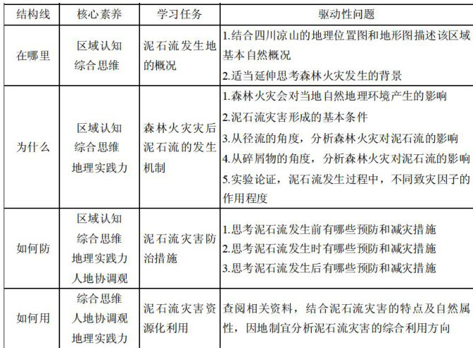 【摘要本文以四川凉山泥石流灾害为例,阐述高中地理自然灾害项目化学习内涵,提出整合性、结构性、进阶性、生成性等实施策略,围绕“四川凉山森林火灾灾后泥石流"创设大情境,通过确立“四川凉山泥石流灾害的成因、防治及资源化利用”主题,设计阶梯式学习目标,构建“在哪里、为什么、如何防、如何用"的驱动性任务群,运用多元评价方式评估学生的地理学科核心素养。