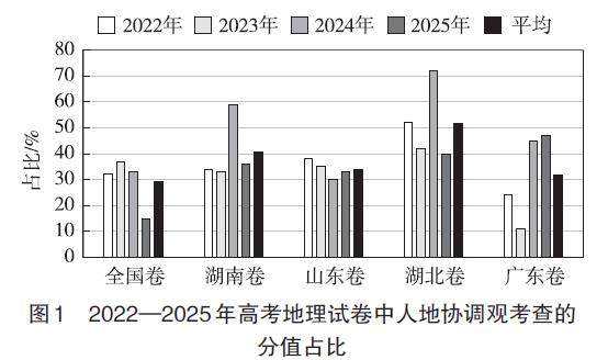 摘 要:人地协调观是地理学科的核心价值观,也是高考地理考查的重点。本文从人地协调观的3个维度对2022—2025年全国卷、湖南卷、山东卷、湖北卷和广东卷进行定量分析后发现,近4年各试卷对人地协调观的考查内容平均占比为37.40%;对人地协调观3个维度的考查比例虽存在差异,但整体趋于均衡。考查情境以生产情境和生活情境为主,分别占比47.37%和30.26%,在考查时覆盖了高中地理诸多必备知识。建议在