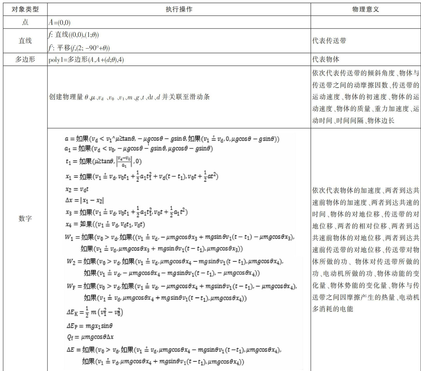 摘要:借助GeoGebra软件对传送带模型进行可视化处理,将抽象物理概念、动态运动过程以及功与能的关系以直观方式呈现。通过动态演示功能,实现了运动过程的实时展示和数据的同步呈现,使功能关系的守恒特性得以清晰展现。这种可视化教学方法有助于学生建立正确的物理观念,深入理解物体运动状态变化与能量转换的物理本质,从而有效突破传送带模型的学习难点。