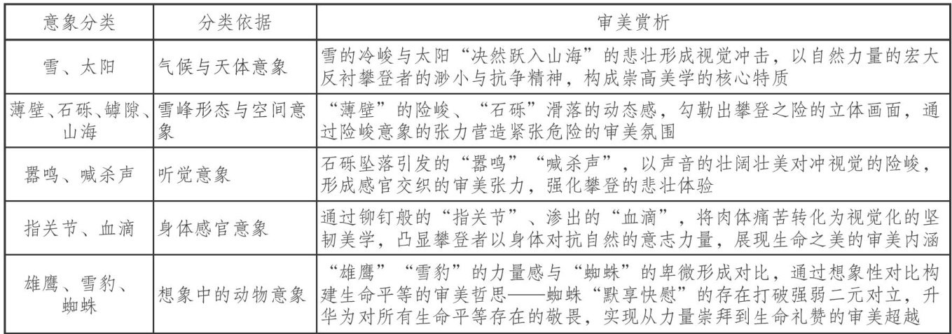 摘要基于“审美鉴赏与创造”核心素养要求,可以尝试从意象、抒情主人公形象与时代语境三个维度对昌耀的《峨日朵雪峰之侧》展开审美解读:通过多元意象分类剖析,揭示诗歌悲壮崇高的意境特质与情感变化轨迹;借由抒情主人公形象的转变,展现抒情主人公从对抗自然到敬畏生命的精神成长;结合诗人昌耀的个人经历与时代背景,挖掘诗歌在历史语境中对青春韧性及生命价值重构的哲思意义。该诗独特的审美特质为语文教学提供启示,教师可采用意象解码、形象共情、时代勾连等教学路径,助力学生理解青春内涵,为落实“审美鉴赏与创造”核心素养提供范例。