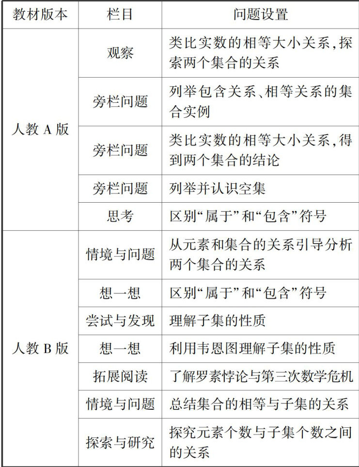 【摘要】人教A版与B版“集合的基本关系”一节的教材内容都遵循课标,使得基础知识能够全面体现,但风格迥异.从栏目设置、概念呈现、例题练习三个方面进行比较,在理解编写意图和新课程理念的基础上提供教学启示,以期更好地发挥教材的互补性价值.