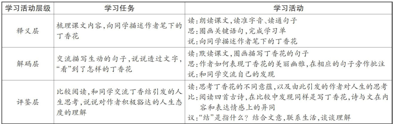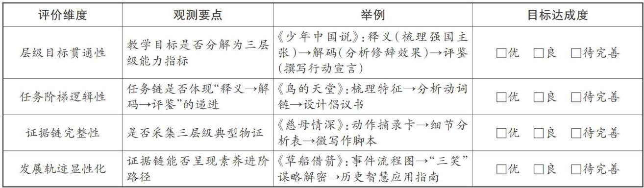 【摘要】基于“三层级阅读教学理论”,教师可从基础层(释义层)、关键层(解码层)到高阶层(评鉴层)搭建进阶系统,通过“定标"确立进阶式教学目标,通过“规划学程"设计层进式学习任务与活动,通过"立据"构建循证评价体系,形成“教学目标一学习历程一评价证据”的闭环,从而实现“教一学一评”一体化,促进学生核心素养的发展。