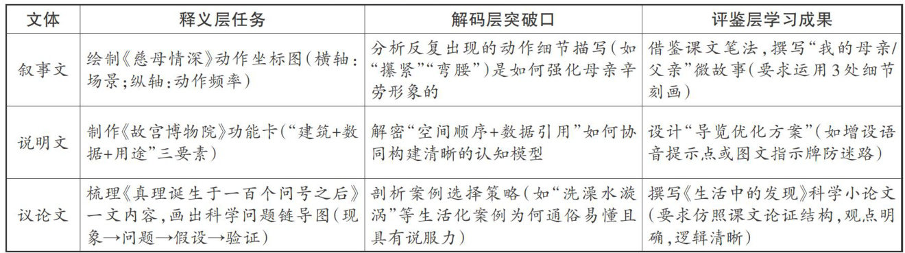 【摘要】以三层级阅读教学理论为逻辑框架,构建贯通多类文体的“教一学一评"一体化实践路径时,教师可通过提炼“信息结构化 $$ 形式解密 $$ 迁移创新"的认知进阶链,实现叙事文、说明文、议论文等文体在统一逻辑下的素养培育;创新设计“目标层级设计 $$ 任务实施留据 $$ 评价循证反馈”闭环机制,弥合目标设计虚化、教学内容随意、效果评价失据的实践断层,从而为素养导向的"教一学—评"一体化课堂转型提供可复制的实践策略。