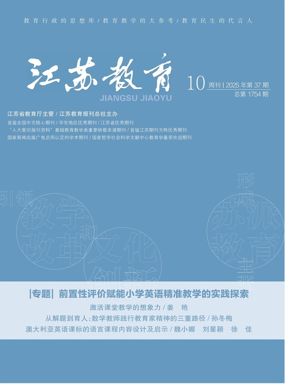本刊由江苏省教育厅主管,江苏教育报刊杜主办、出版和发行。由独家策划、专题、视点、教育观察、管理智慧、问题讨论、观点参考、讲述、校园零距离、教海探航、课堂经纬以及杏坛文荟、视野等品牌栏目构成。