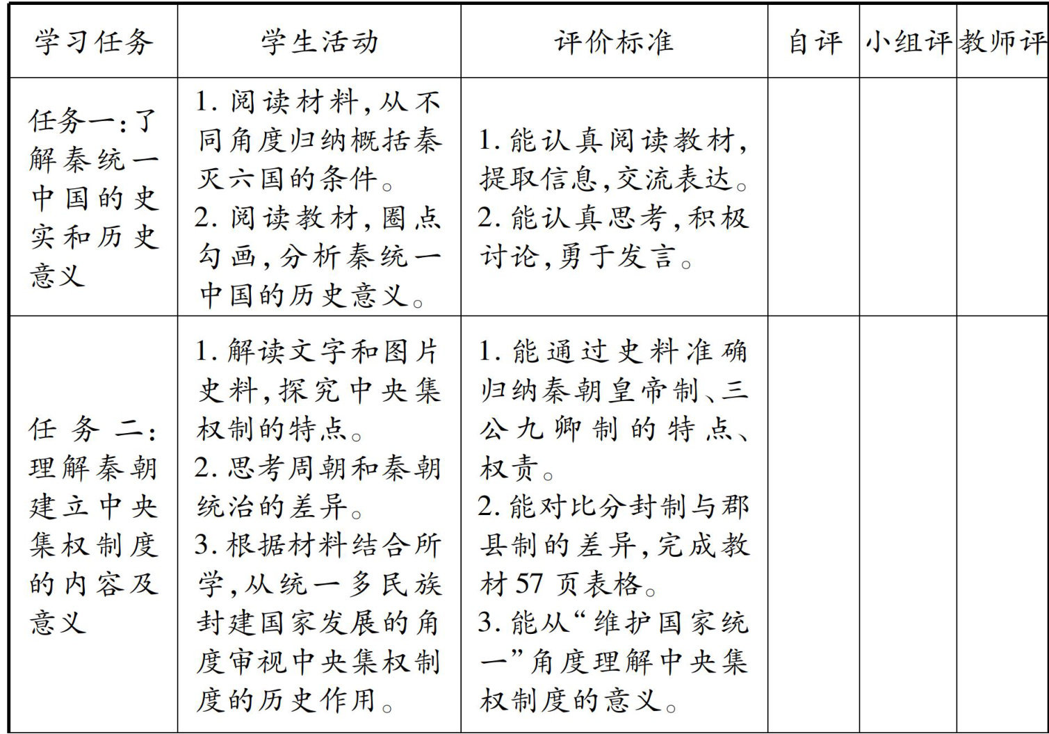 《义务教育历史课程标准(2022年版)》明确要求用评价结果改进教师的教学行为和学生的学习方式,使教、学、评相互促进,共同服务于学生核心素养的发展。这为初中历史教学指明了方向。本文以统编版历史七年级上册第9课《秦统一中国》的教学为例,探索基于“教—学—评”一体化的初中历史教学设计,培养学生学科核心素养,落实立德树人根本任务。 一、“教一学一评”一体化的初中历史教学设计的实践意义 1.依标施教,落