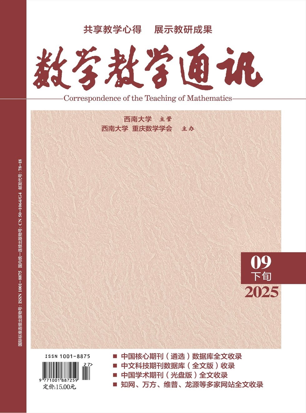 《数学教学通讯》杂志是由西南大学主管,西南大学数学与统计学院与重庆数学学会主办的中学数学教学研究类期刊,创刊于1979年。近30年坚持为中学数学教学服务的办刊宗旨:坚持与时俱进,始终站在数学教育研究的前沿;坚持贴近教学实际,贴近读者要求,为读者提供实用、优质的教学研究平台与资源。本刊以“贴近课改、服务教学、共同成长”为办刊宗旨,探讨新课程下的教学改革、教育实践,着力打造集实用性、知识性于一体的数学核心期刊。