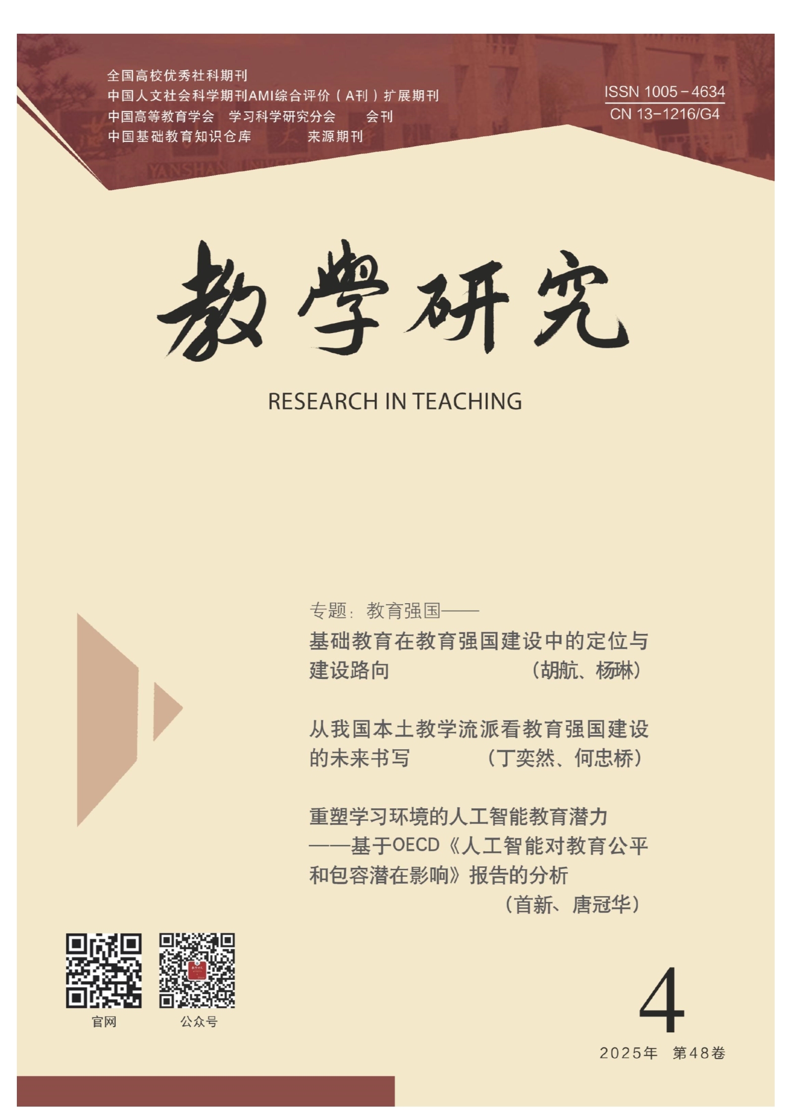 筑基·传承·革新 教育强国建设的三维路径 主持人语: 教育强国的宏图,既需深植于基础教育的根系之中,亦需激活传统智慧的基因密码,更需在技术浪潮中重构生态法则。本期栏目以破解矛盾为刃,以系统思维为舵,从战略破局、文化根脉与数字变革三重维度,立体呈现中国教育现代化攻坚期的多元路径。 筑基固本,破局攻坚。基础教育作为教育强国的“第一公里”,其改革深水区亟待系统性突破。《基础教育在教育强国建设中的定