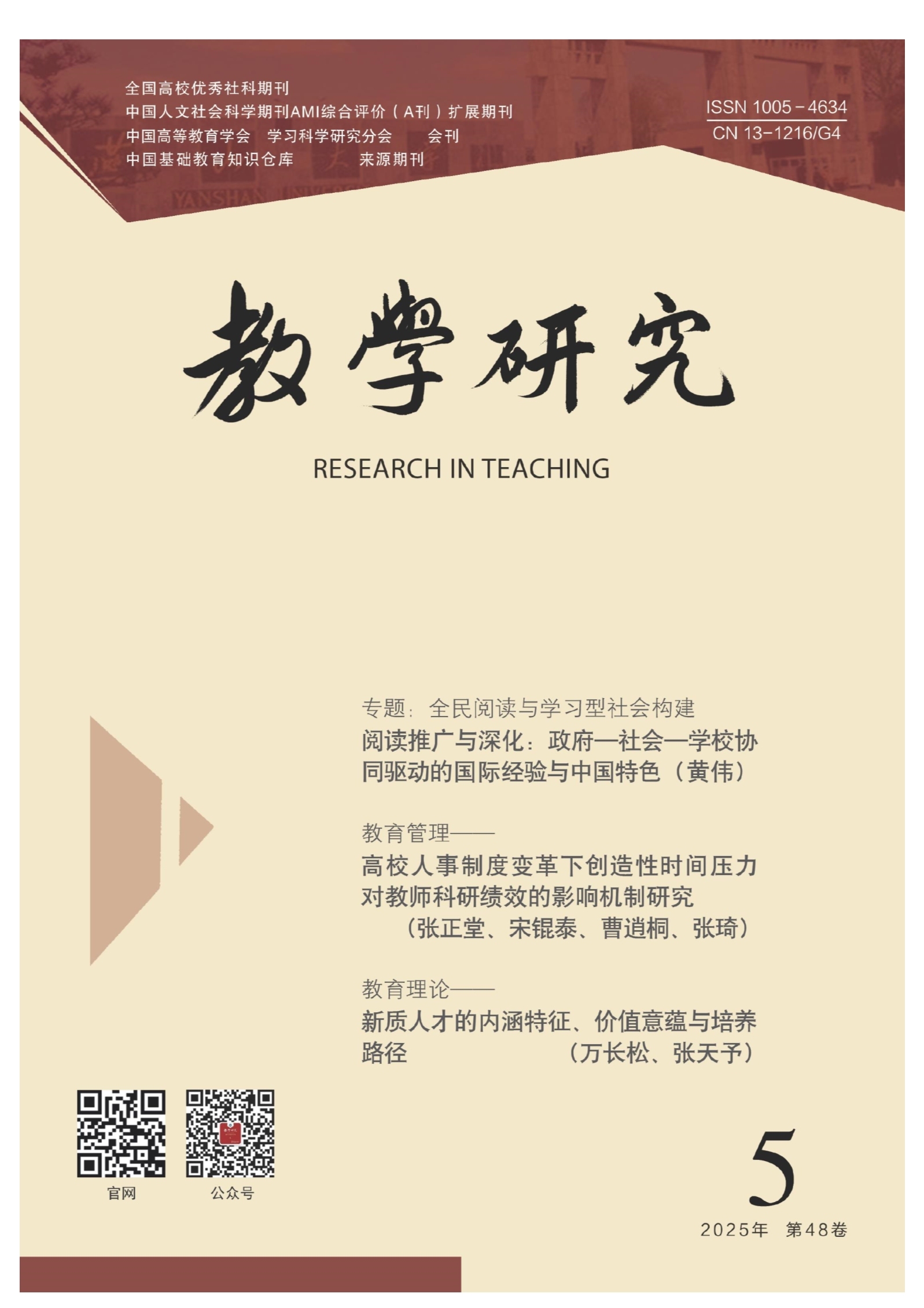 [摘要]作为推动高质量发展的核心动力,新质生产力对人才培养提出了全新要求。“新质人才”是具备创新型、动态型、复合型特征的高素质人力资源,其能力维度呈现从“线性发展”到“多维协同”的范式转型,是破解“卡脖子"技术、重构产业竞争优势的关键变量。从创新驱动发展、产业转型升级、国际竞争能力三个角度出发,论证了培养新质人才的当代意义并提出以下路径:对接新兴产业动态调整学科专业,推动传统学科与前沿技术深度融合;依托人工智能与STEAM教育构建跨域育人体系,突破学科知识生产壁垒;深化产教融合与基础教育贯通培养,构建全链条人才培育机制;建立以创新价值、能力、贡献为导向的多维评价体系,激活人才发展内生动力。